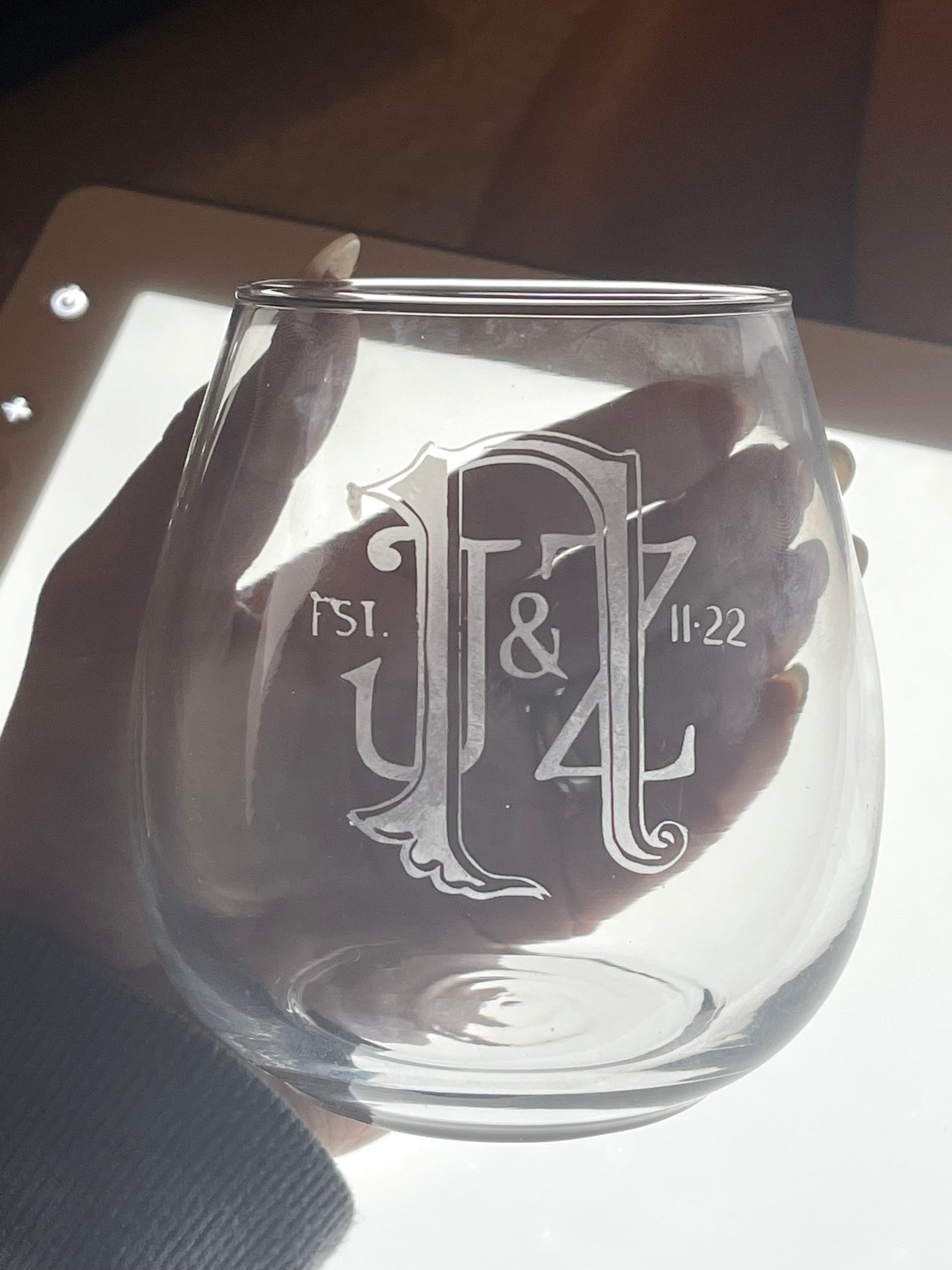 The perfect addition to any bar set-up! Pick any design to be etched onto the wine glasses or choose an initial and a font from our font selection. If the design is too complicated, we will work with you to simplify to still make your crafty dreams come true! Orders come in sets of 4.