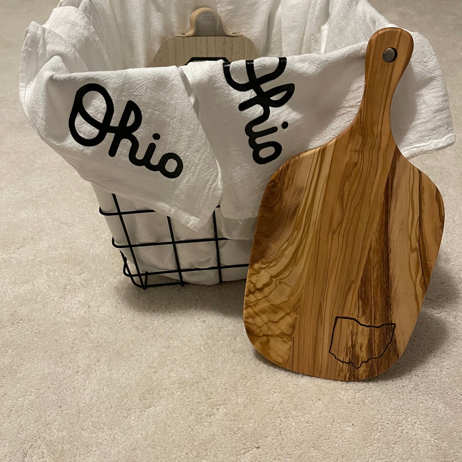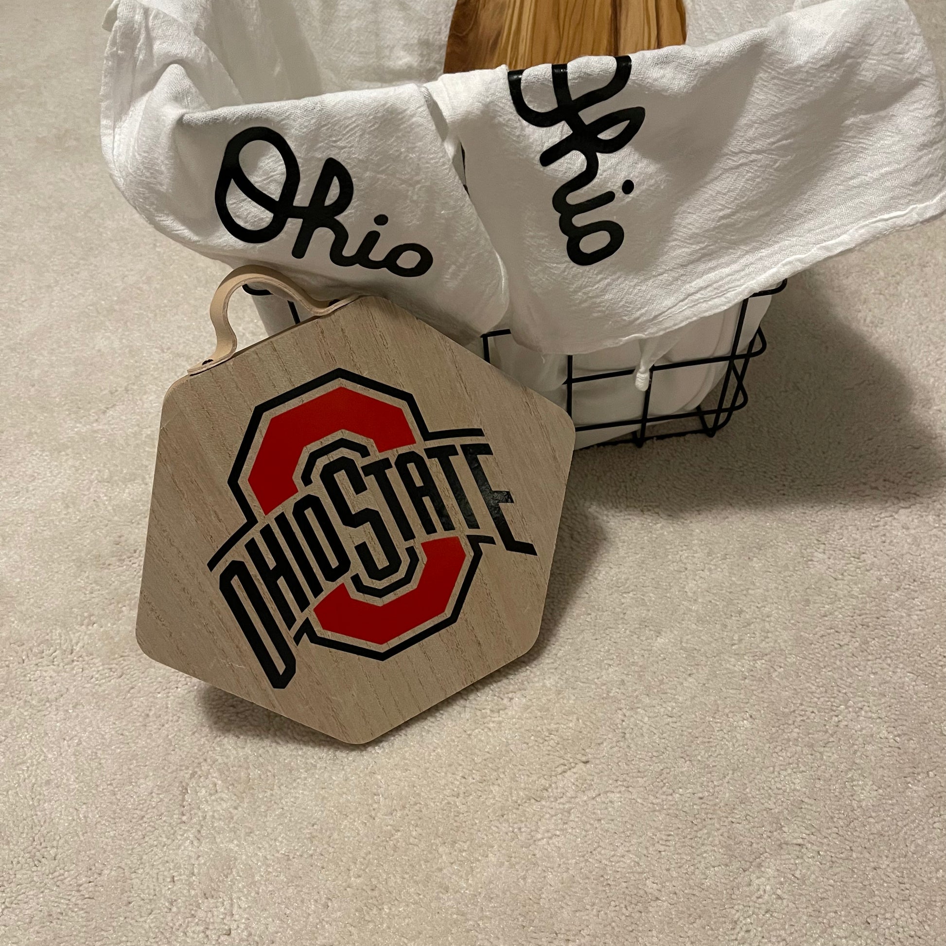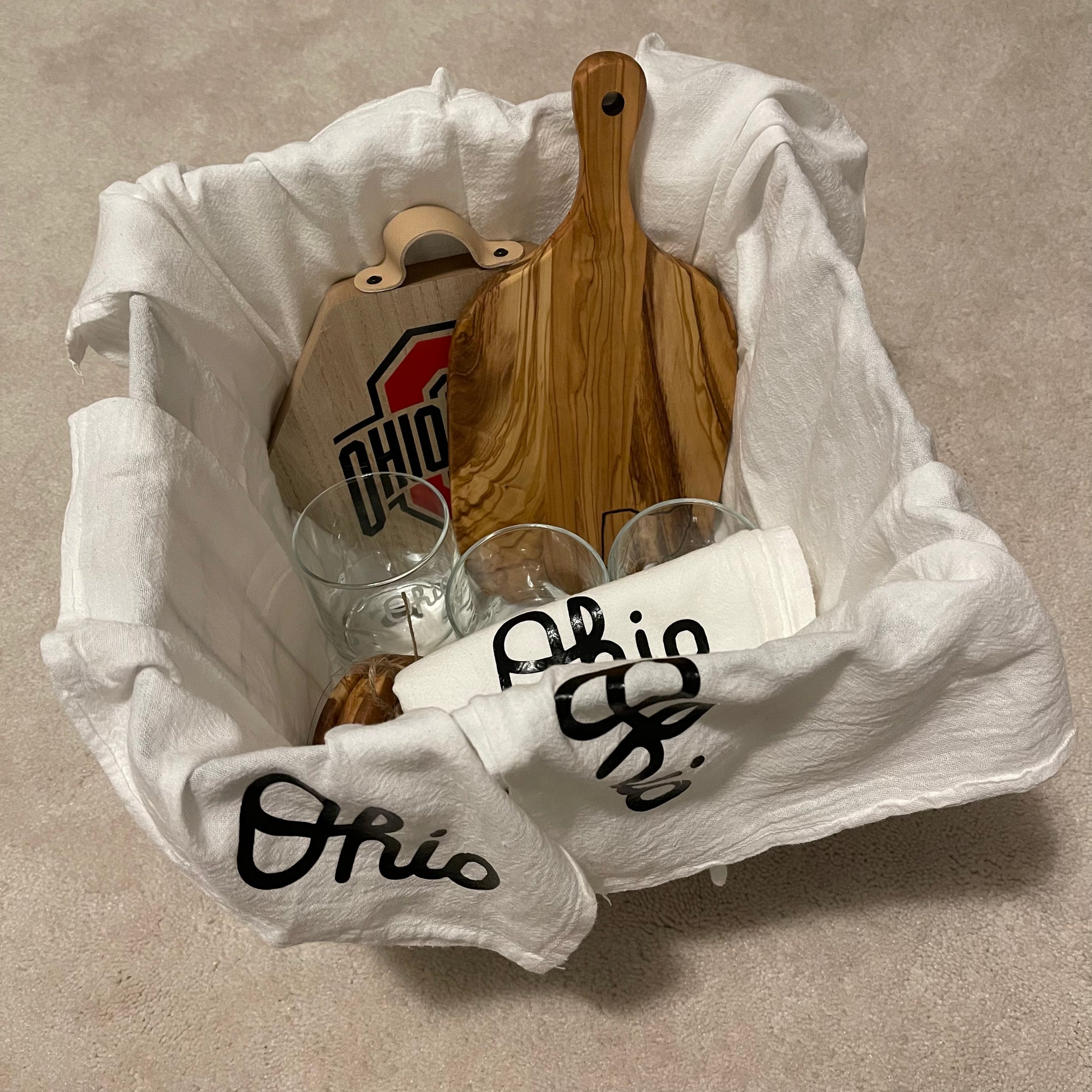 Need a box of fun for your next fundraising event? Look no further! This mixed basket includes 4 large personalized napkins, a small hexagon sign, a woodburned small cutting board, 3 etched DOF glasses, and a set of 4 woodburned coasters.